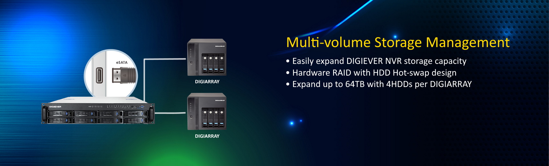 DIGIARRAY adopts multi-volume technology to create a whole new storage space for DIGIEVER NVR. Multi-volume storage management will combine all RAID units to DIGIEVER IP surveillance ecosystem, DIGIEVER NVR and DIGIARRAY, to efficiently reserve your important data.