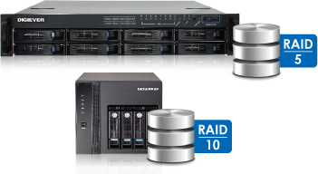 DIGIARRAY is an external storage expansion unit for DIGIEVER NVR series. It satisfies customers’ request of higher storage need. One DIGIEVER NVR can connect up to 2 DIGIARRAY units that can easily expend up to 8 HDDs and up to 128TB for recording files. With more storage, users can have more flexibility to optimize camera resolution, frame rates, image quality and record for a longer period of time.