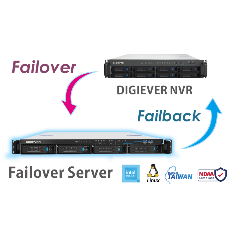 DFS-4232-RM is a true PC-less and 4-bay standalone NVR failover server that prebuilds 32-channels licenses for emergent video recording and monitoring. With the maximum of 72TB storage capacity, Failover Server can ensure 24/7/365 video recording. Once Failover Server detects original DIGIEVER NVR restores it functionality, Failover Server will failback to DIGIEVER NVR and continue its NVR monitoring service.